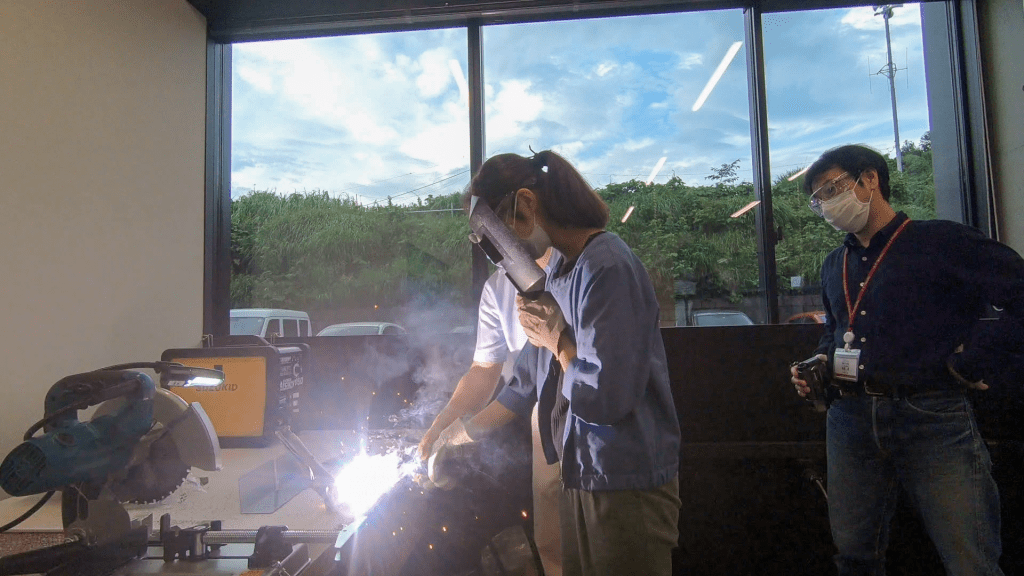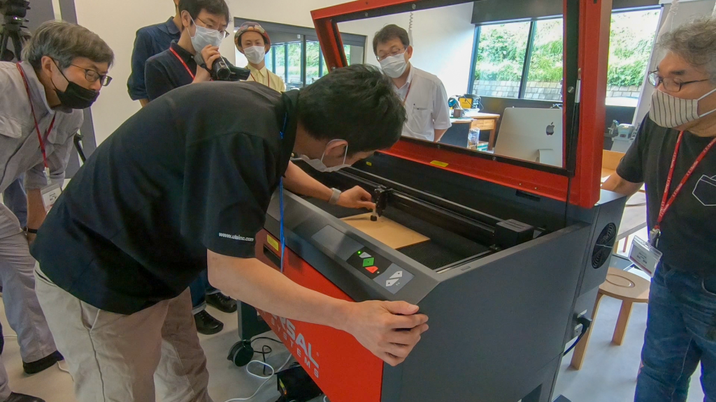安全衛生管理の説明が冒頭の1時間(安全な作業が最も大切です)、そのあと、3チームに分かれて、最新のレーザーカッターほか加工機器や金属溶接の作業法などの講習が行われました。