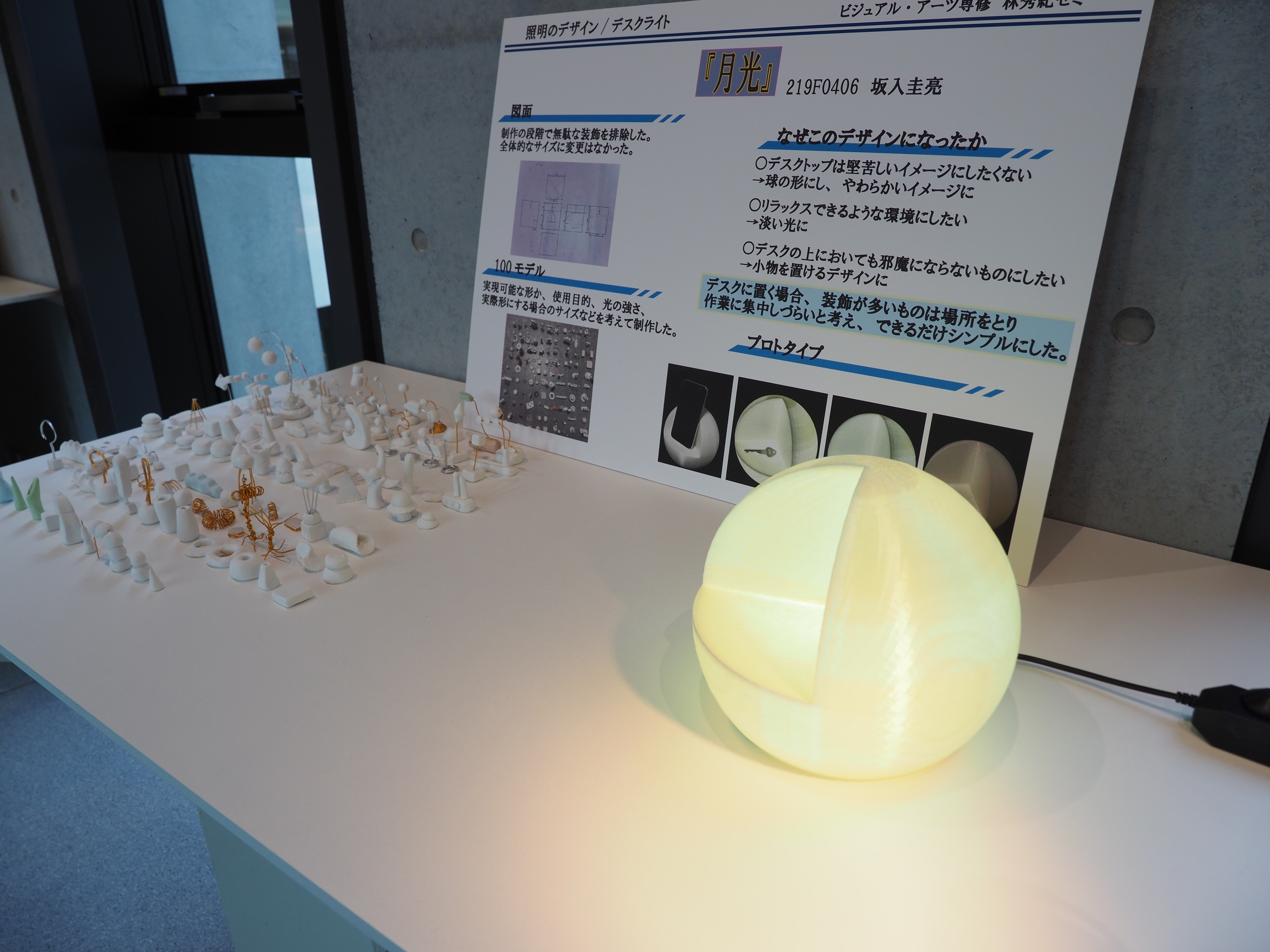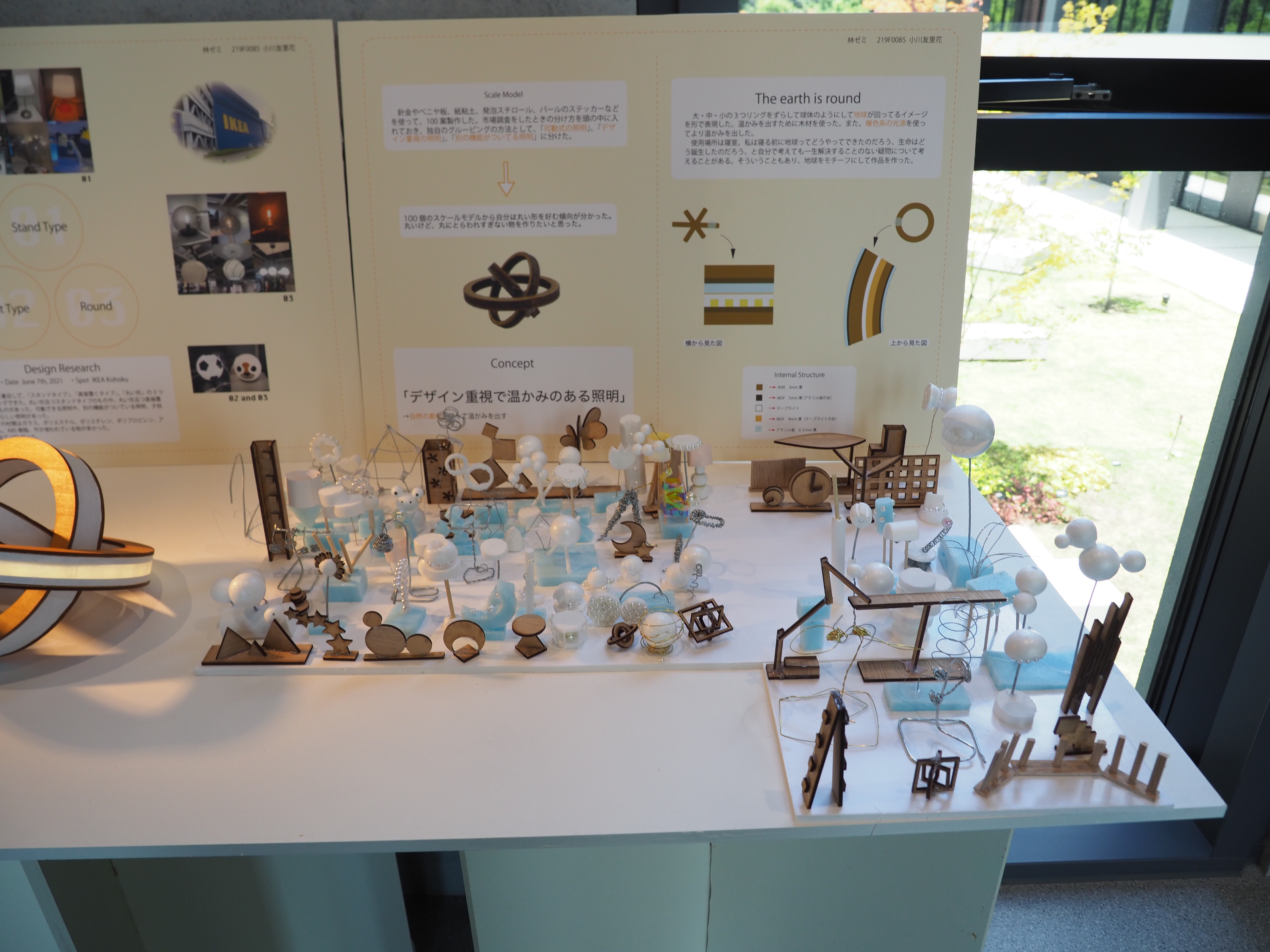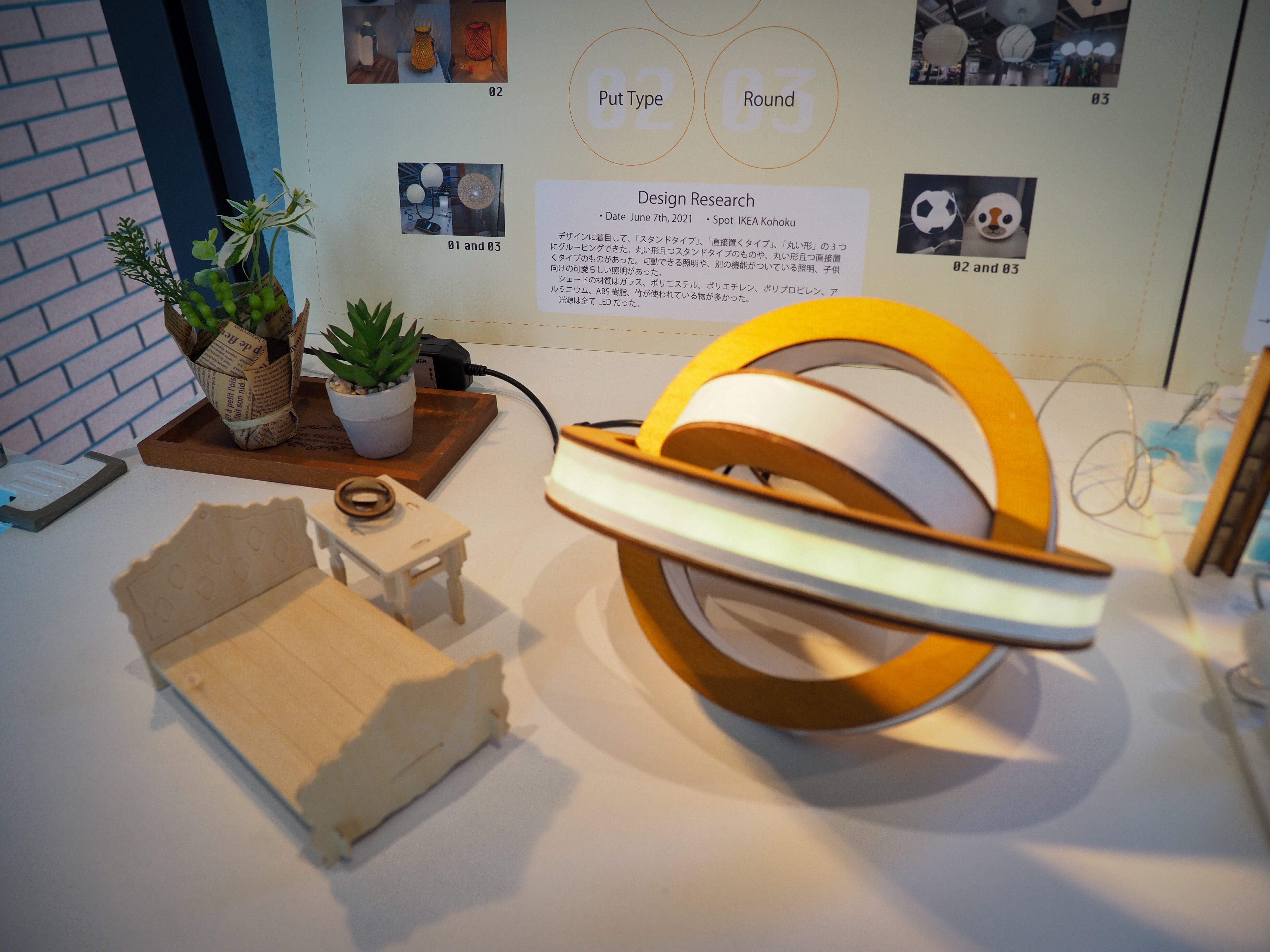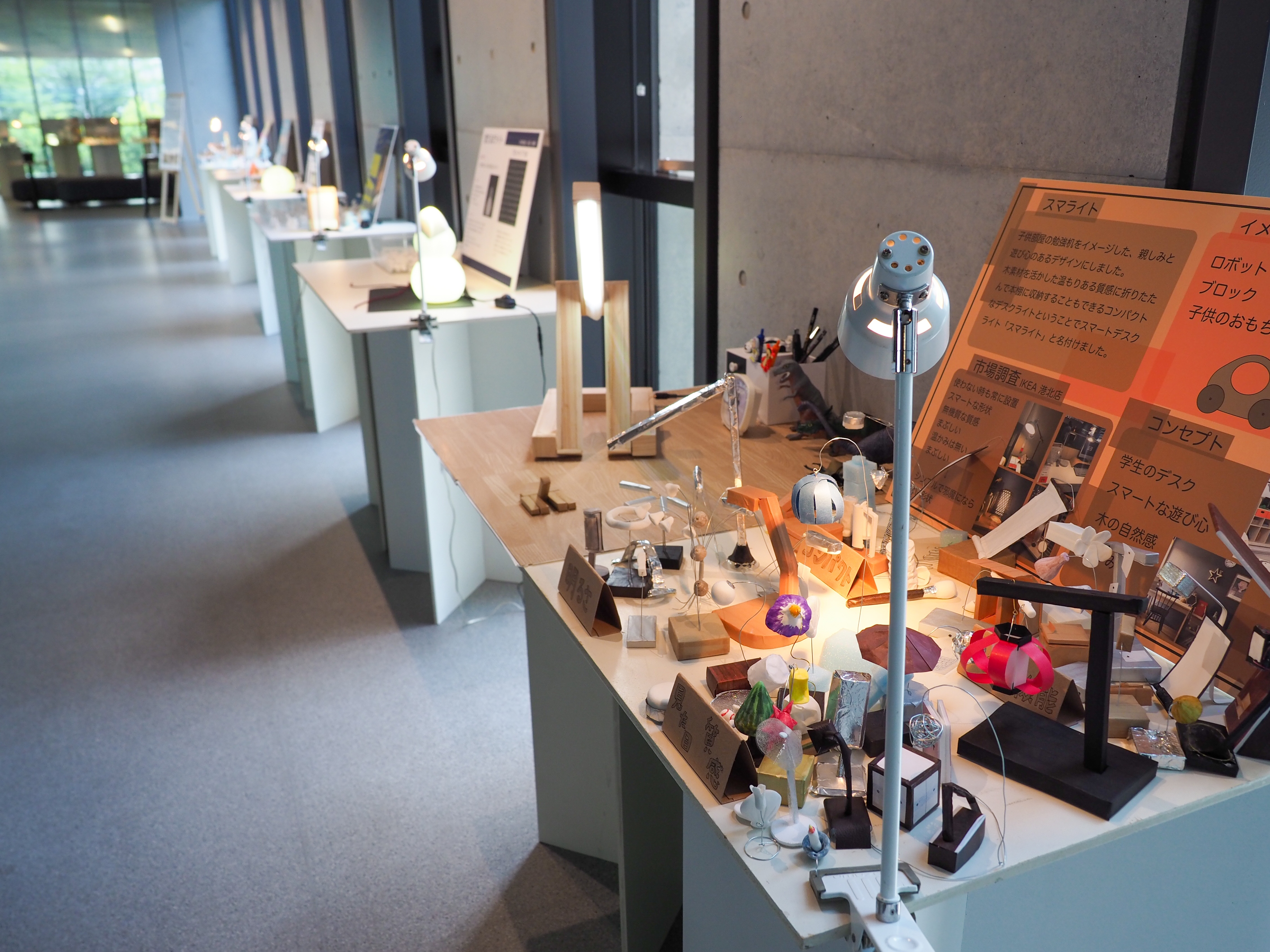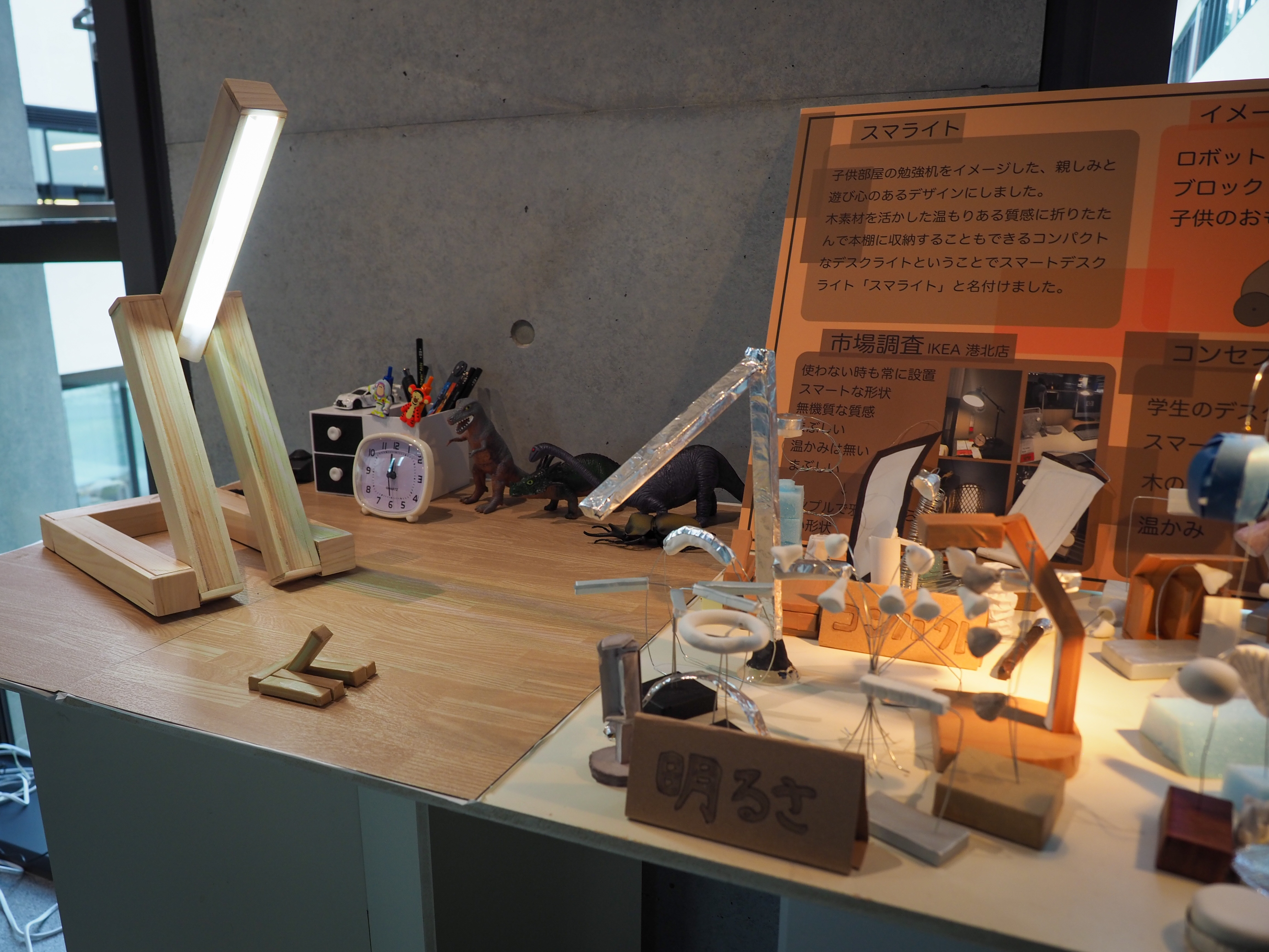 春学期3年生ゼミ展の作品です。学生自身が使用する照明器具をデザインしました。本課題の目標は発想力とプロトタイピング力の向上です。